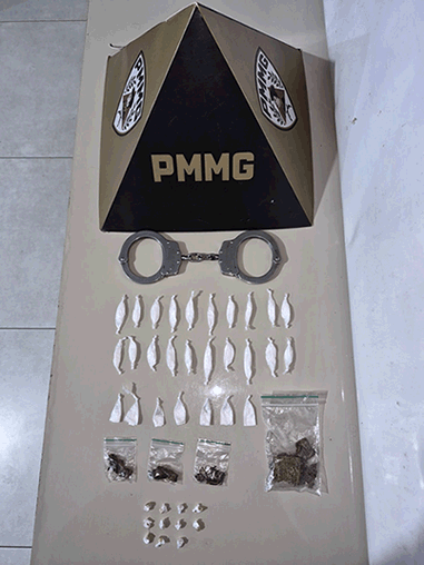 Durante buscas no imóvel, foram apreendidos 27 papelotes de substância semelhante a cocaína, 11 pedras de substância semelhante a crack, uma porção de substância semelhante a maconha, três buchas de substância semelhante a maconha do tipo skank, um telefone celular e R$ 445,00 em dinheiro, além de registros fotográficos relacionados ao roubo.